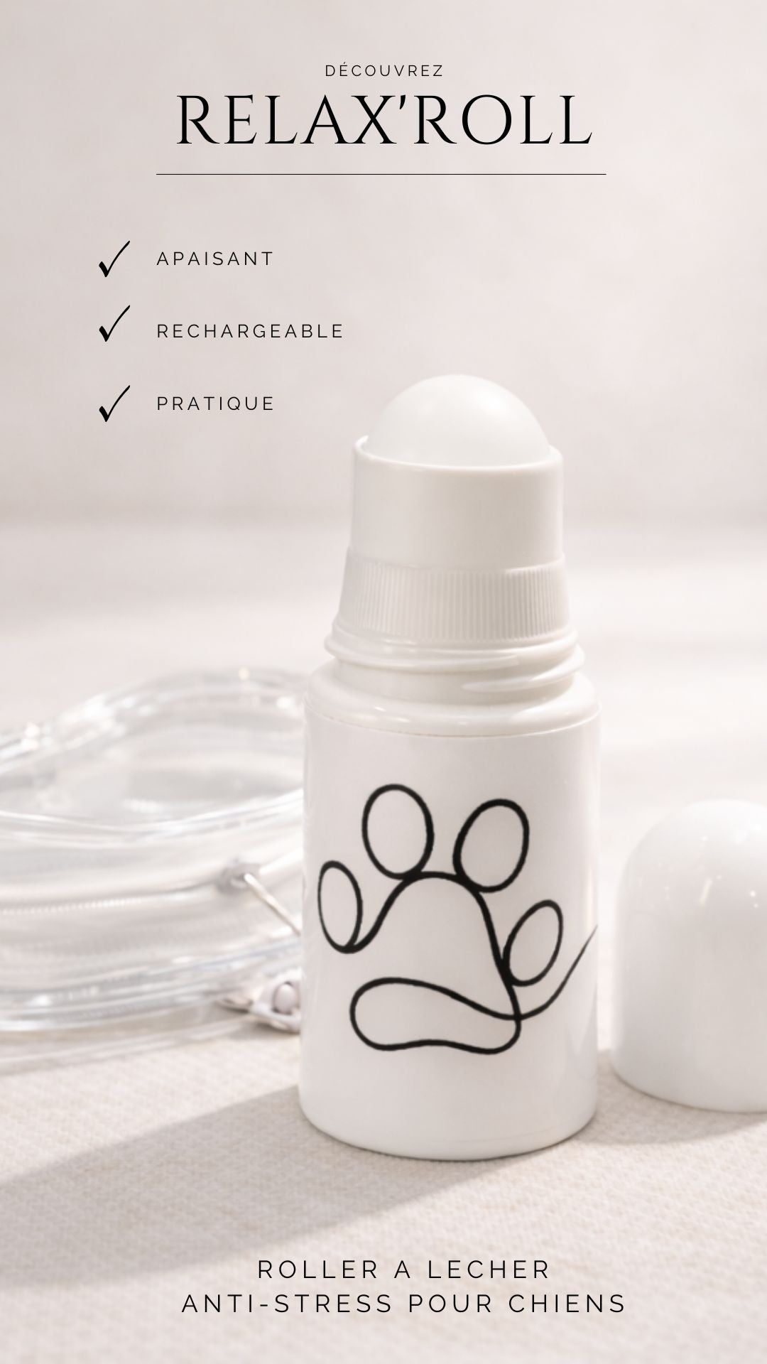 Le Relax Roll est un roller à lécher conçu pour apaiser naturellement votre compagnon. Né de mon expérience avec ma propre chienne lors des consultations vétérinaires qui la stressaient beaucoup, cet accessoire utilise le pouvoir relaxant du léchage pour détendre les chiens nerveux, aboyeurs ou stressés.